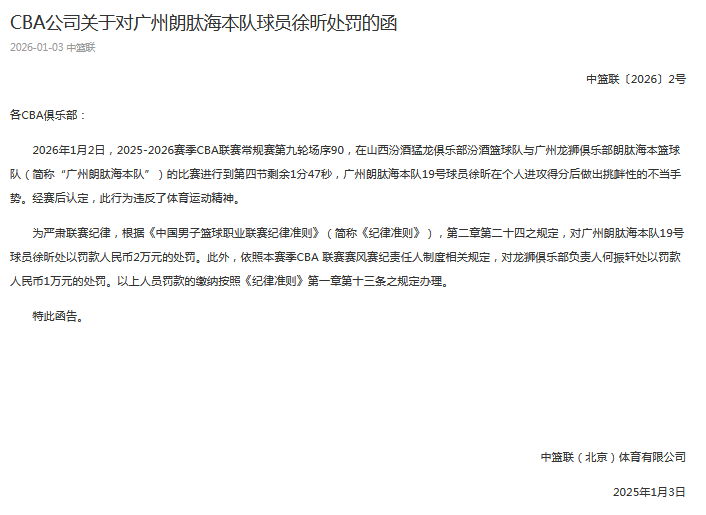 北京时间1月3日,CBA官方公示罚单,广州客场击败山西的比赛当中,徐昕在个人进攻得分后做出挑衅性的不当手势。经赛后认定,此行为违反了体育运动精神, 处以罚款人民币2万元的处罚。
