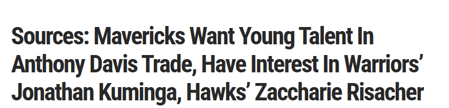 阿夫塞斯写道:“消息人士此前透露,若独行侠最终决定交易戴维斯,他们会优先争取至少一名实力出众的年轻球员。消息人士还称,在那些内部讨论过引进戴维斯的球队中,独行侠对勇士的库明加和老鹰的里萨谢很感兴趣。”