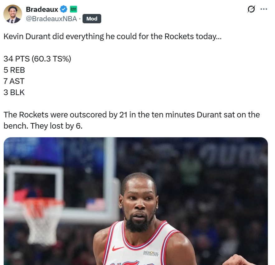 正如赛后火箭媒体人Bradeaux所说:“杜兰特今晚已经倾其所有燃尽,当他在板凳席休息的那10分钟时间里面,火箭队输给对手21分,最终以6分之差输掉比赛。”