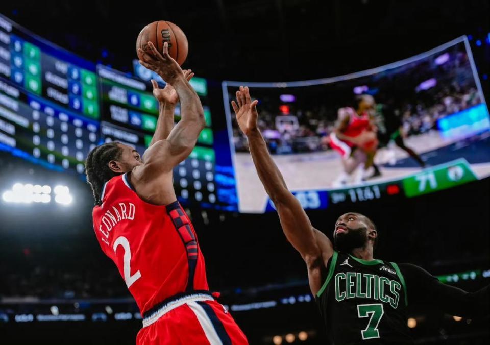 下半场比赛开始,易边再战,伦纳德低位转身干拔跳投得手,揭开第三节比赛序幕,布朗罚球线干拔跳投立马还击一球,怀特手感火热,突袭篮下后仰跳投再进一球,哈登油漆区飞身高抛上篮挑落两分,伦纳德加强进攻侵略性,到禁区内高举高打制造杀伤,站上罚球线两罚全中,克塔的一个平民上篮终结还以颜色,怀特的大号三分火速跳投长虹贯日,直坠篮心,科林斯飞身抛投擦板得手。眼看着快船就要追上比分,绿军第三节末段一波小高潮再次打崩快船,布朗第三节单节轰出19分,三节比赛打完,凯尔特人113-99领先快船14分。