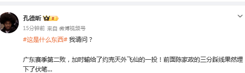 媒体人“孔德昕”发文点评:“广东赛季第二败,加时输给了约克天外飞仙的一投!前面陈家政的三分踩线果然埋下了伏笔…”