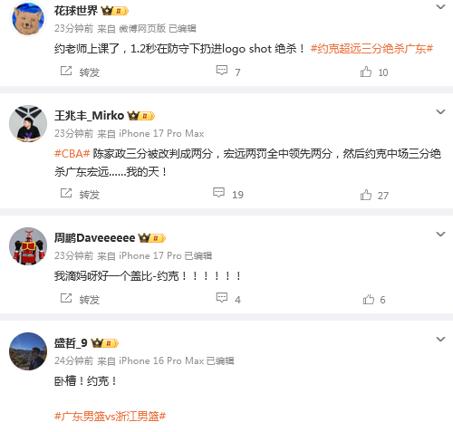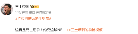 篮球记者“贾磊”发文点评:“神奇的绝杀!浙江队在客场加时赛击败广东!约克最后时刻用一记神奇的三分球帮浙江赢下了这场胜利”