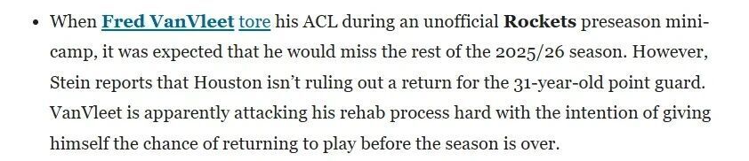 本赛季开赛前,范弗利特意外遭遇右膝前交叉韧带撕裂,去年夏天以两年5000万美元续约火箭。