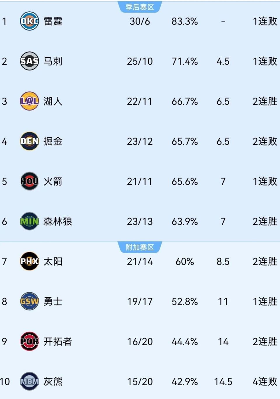 当前西部前三甲分别是30胜6负的雷霆、25胜10负的马刺,以及22胜11负的湖人,遭遇严重伤病潮的掘金则以23胜12负位列西部第四。