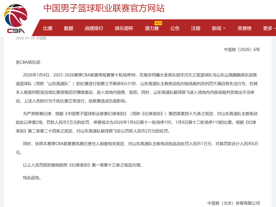 在刚刚,CBA公司给山东队主教练邱彪开出了一份大罚单,对他进行了罚款60000元+停赛2场的处罚。同时,对山东队翻译薛飞罚款20000元!