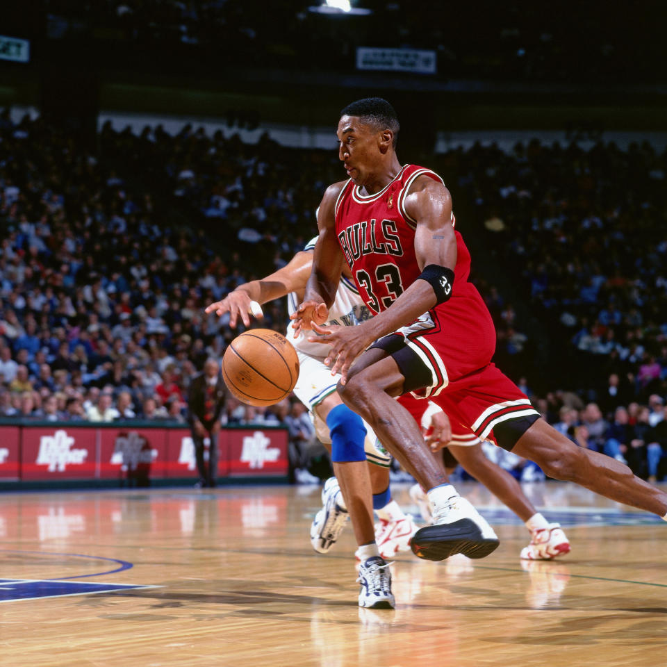 如果我们翻开NBA的历史助攻榜单,你会发现在詹姆斯的名字旁边是一众传奇控卫:斯托克顿、保罗、基德……作为一名锋线球员,詹姆斯的名字在其中显得格外特别。顺着这份榜单一路向下看下,直到第30位,你才会找到第二名全尺寸锋线的名字——斯科蒂-皮蓬。