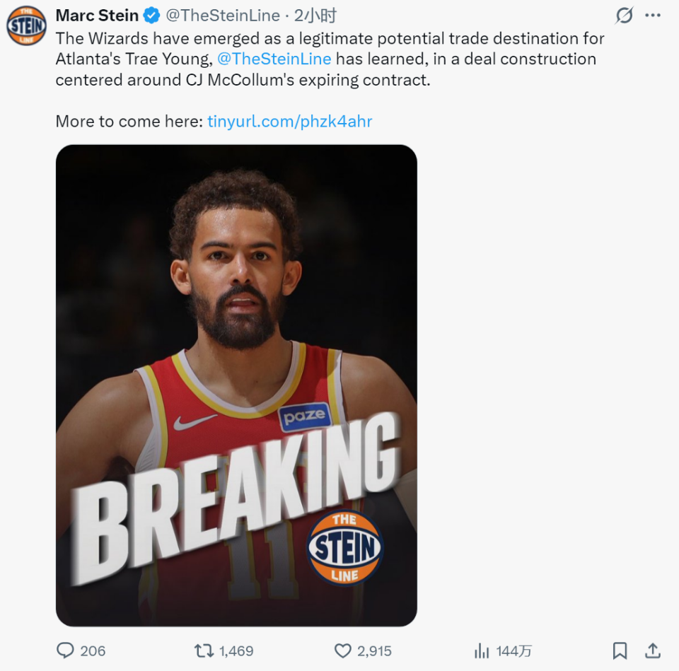 另一记者Marc Stein最新爆料,奇才已成为特雷杨一个交易目的地,奇才送出的主要筹码是CJ-麦科勒姆的到期合同。CJ的合同是2年6400万美元,今年夏天到期,本赛季薪水3067万美元。这笔交易肯定不是1换1,奇才还得搭上其他球员。