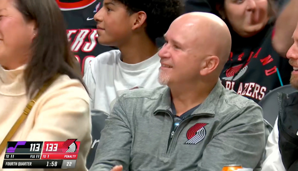 就在皮球应声入网的瞬间,现场导播极其懂球地将镜头切给了场边的管理层席位。画面中,波特兰开拓者总经理乔克罗宁(Joe Cronin)身体战术后仰,嘴角上扬,露出了一抹不仅是满意、甚至带有几分惊喜的笑容。请注意左下角的计时器——1分58秒,比分133-113。这意味着杨瀚森仅仅用了不到20秒的时间,就让这位掌握球队生杀大权的“操盘手”做出了如此积极的肢体语言反馈。