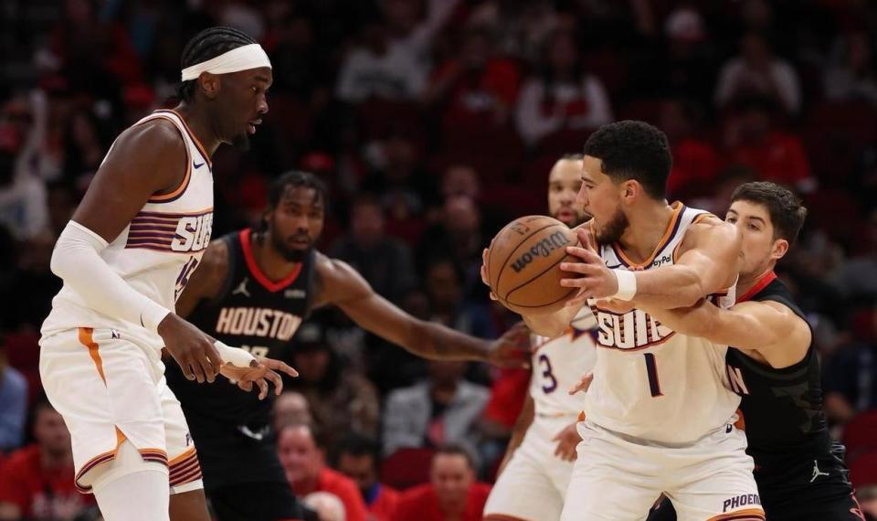 本场比赛,双方在首发阵容上面,火箭这边派出的是杜兰特、小史密斯、伊森、阿门、亚当斯,申京因为上一场比赛中严重受伤缺席。太阳这边派出的是狄龙、奥尼尔、威廉姆斯、布克和吉莱斯皮。首节比赛开始,太阳率先拿到球权,吉莱斯皮的三分开火一击命中,打进本场比赛首个进球,阿门突袭篮下强起上篮也为火箭队开张,狄龙坐打篮下,强吃防守打进一球,布克闪电突破快攻上篮轻松打进,吉莱斯皮手感火热,弧顶追身三分出手一箭穿心,亚当斯顺切篮下,单手劈扣技惊四座,杜兰特借助掩护后的干拔三分球一箭穿心。