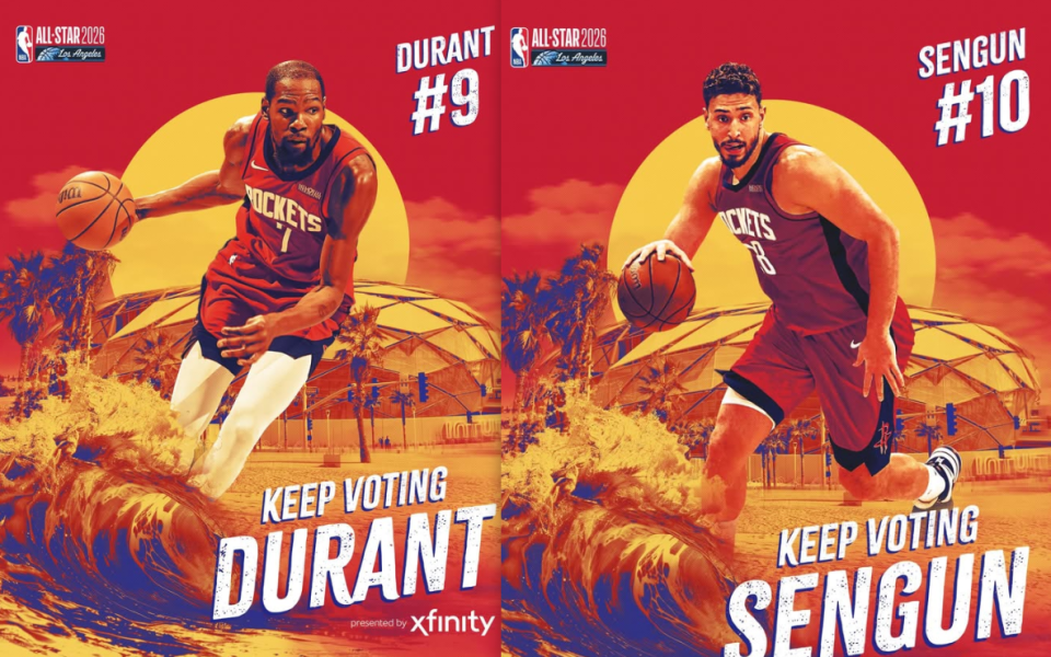 火箭官方晒海报为杜兰特和申京拉票,配文写道:次轮球迷投票结果公布,继续投票,把他们投进前五之列。