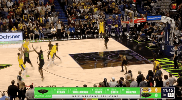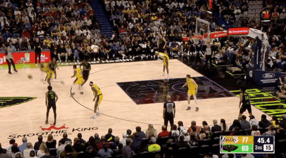 易边再战,墨菲空切上篮,艾顿突破暴扣,费尔斯和墨菲连续得分,东契奇三分命中。锡安突破上篮,艾顿空切得分,奎因冲筐得手,斯马特三分命中。艾顿勾手打进,湖人反超比分,墨菲连得5分,艾顿空接上篮,锡安空接暴扣。斯马特三分命中,墨菲连得5分还以颜色,东契奇突破抛投,奎因挑篮打进。墨菲和马特科维奇连得5分,鹈鹕取得9分领先优势,詹姆斯连得5分予以回应,墨菲突破打进2+1。三节比赛结束,湖人79-86落后鹈鹕。