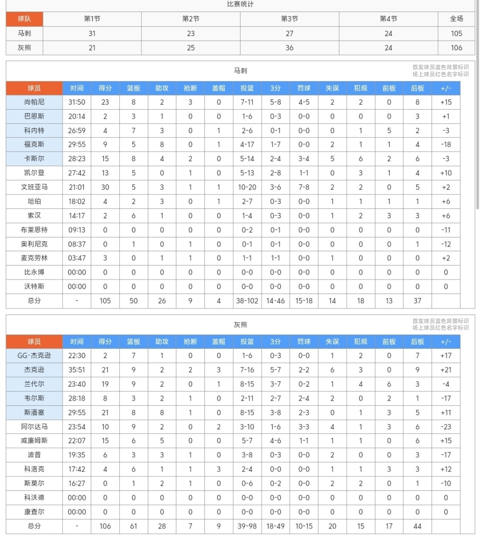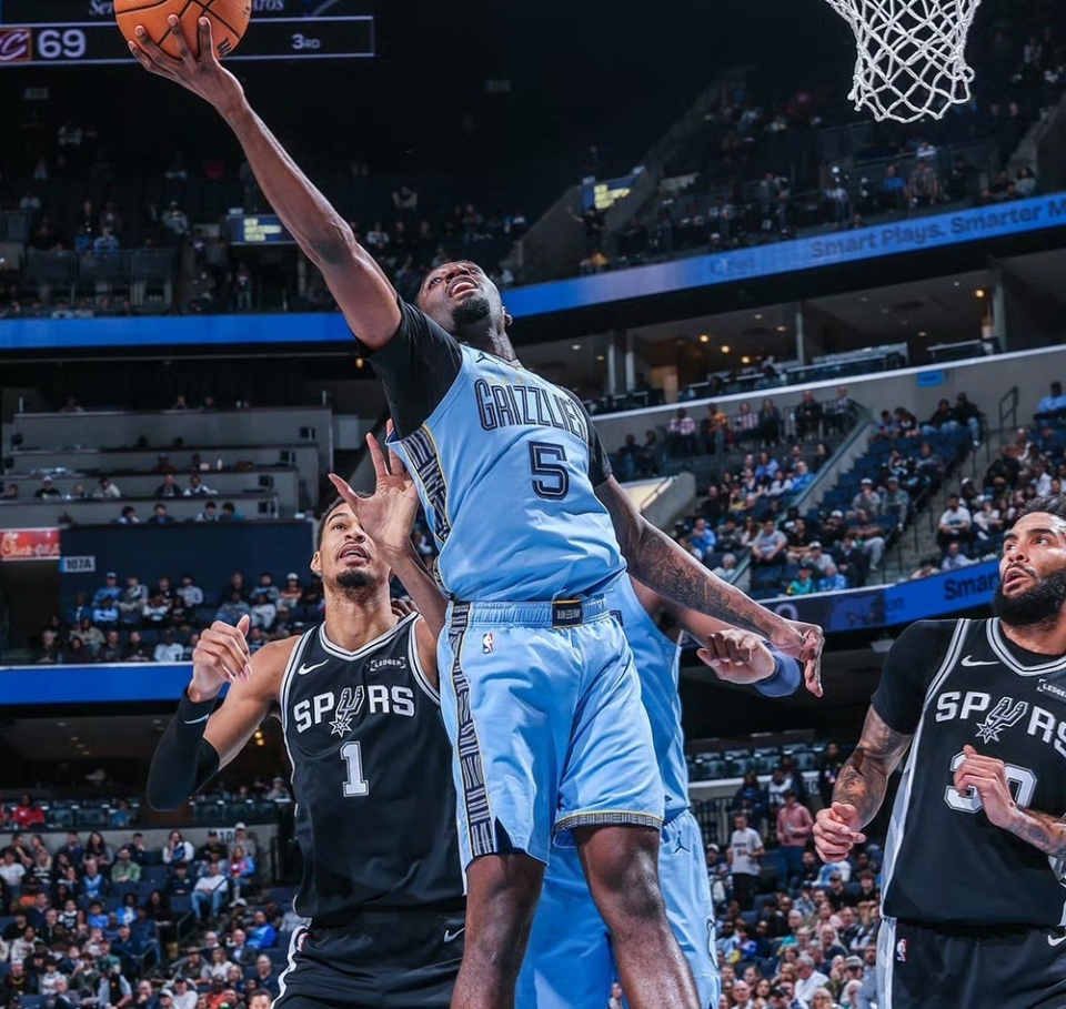 下半场第三节易边再战,贾伦杰克逊联手兰代尔和斯潘塞等人打出进攻高潮,灰熊一度反超了比分,马刺队文班亚马凯尔登等人力保球队紧咬比分,福克斯的命中率惨不忍睹,三节战罢,马刺领先1分,末节双方陷入胶着战,文班亚马彻底暴走,他不仅近筐攻击出色,外线的三分也准了起来,最后时刻两队势均力敌,最终马刺1分惜败!