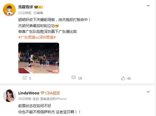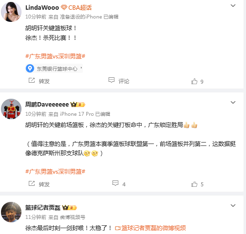 媒体人“周鹏”发文点评:胡明轩的关键前场篮板,徐杰的关键打板命中,广东锁定胜局。