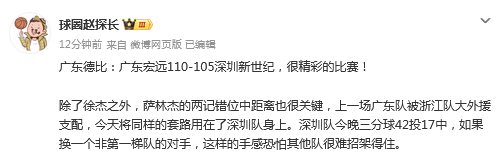 媒体人“赵探长”发文点评:广东德比:广东宏远110-105深圳新世纪,很精彩的比赛。
