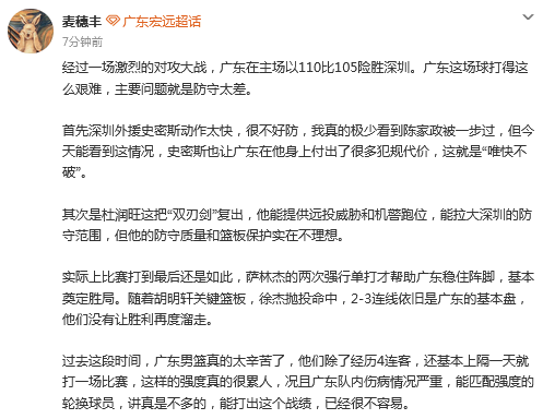 媒体人“麦穗丰”发文:广东这场球打得这么艰难,主要问题就是防守太差。