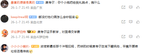 媒体人赵探长发文点评:“麦考尔这表情,有点教育小老弟的感觉,狠绝色啊”。