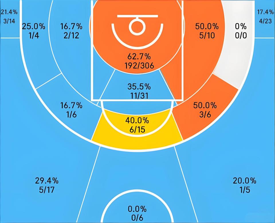 咱们再看看阿门本赛季的投篮热区图,就能更清楚他的问题在哪。三分线外的表现,只能用惨淡来形容,命中率仅为19.7%,基本属于被防守球员放空的状态。但篮下小禁区范围内,就是阿门的甜点区域,终结效率很高,而且他在三分线内一步右侧45°的位置,中投命中率还比较不错。从热区能明显看出来,阿门在投射端的短板很突出,但也不是全无可取之处,右侧45°的中投,就是他可以重点打磨的突破口。