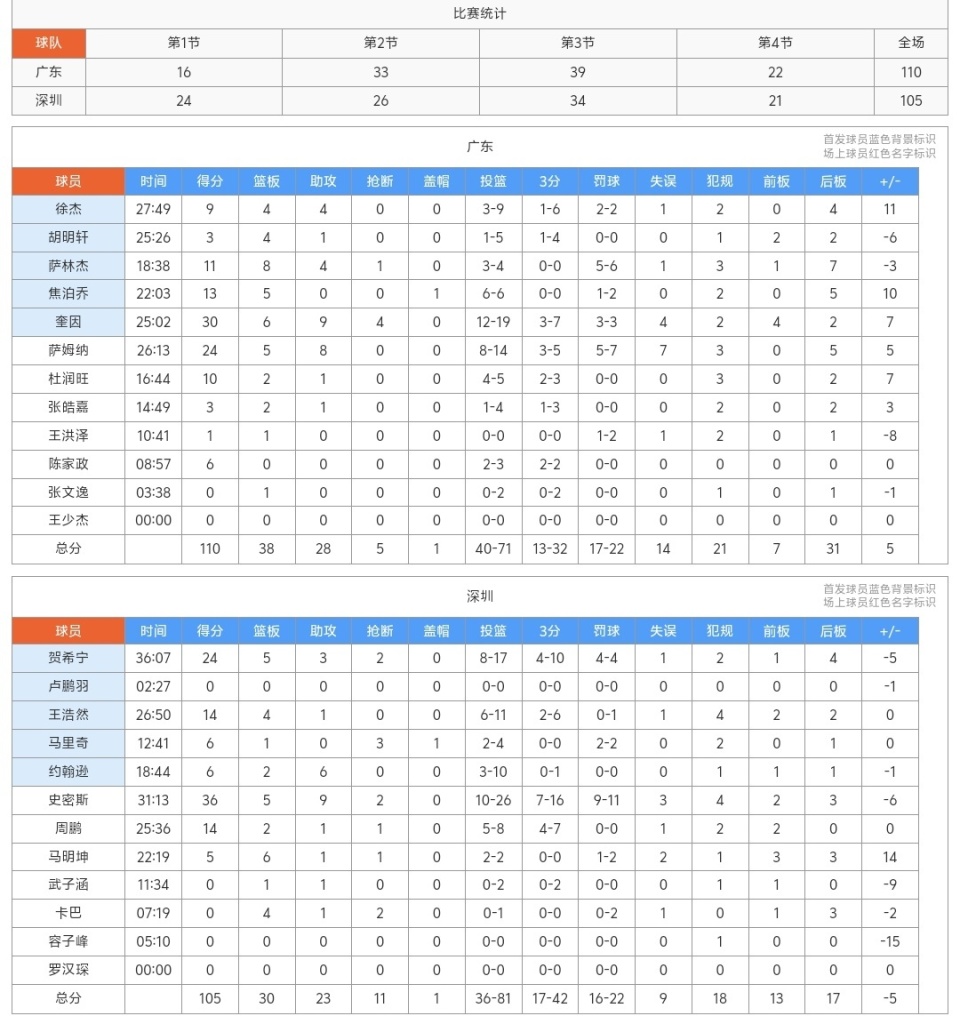 广东队首发:萨林杰、徐杰、胡明轩、奎因、焦泊乔!