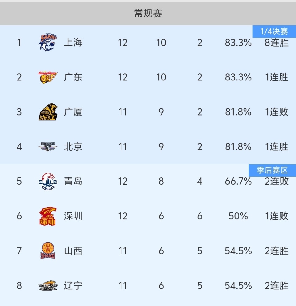 北京时间1月7日,CBA常规赛,广东男篮主场击败了深圳,目前广东10胜2负,排名联赛第二,上海男篮90-73大胜青岛,排名第一,CBA前四的球队目前还没有明显的差距,青岛已经开始掉队了!