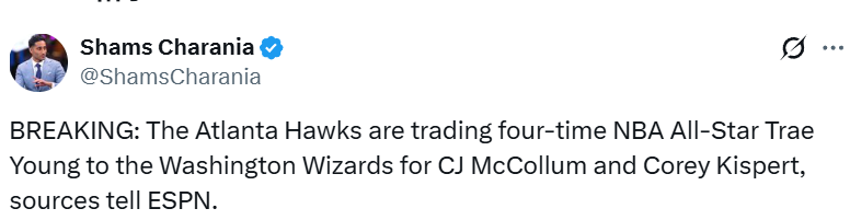重磅1换2交易达成!老鹰送出特雷-杨 从奇才得到麦科勒姆和基斯珀特