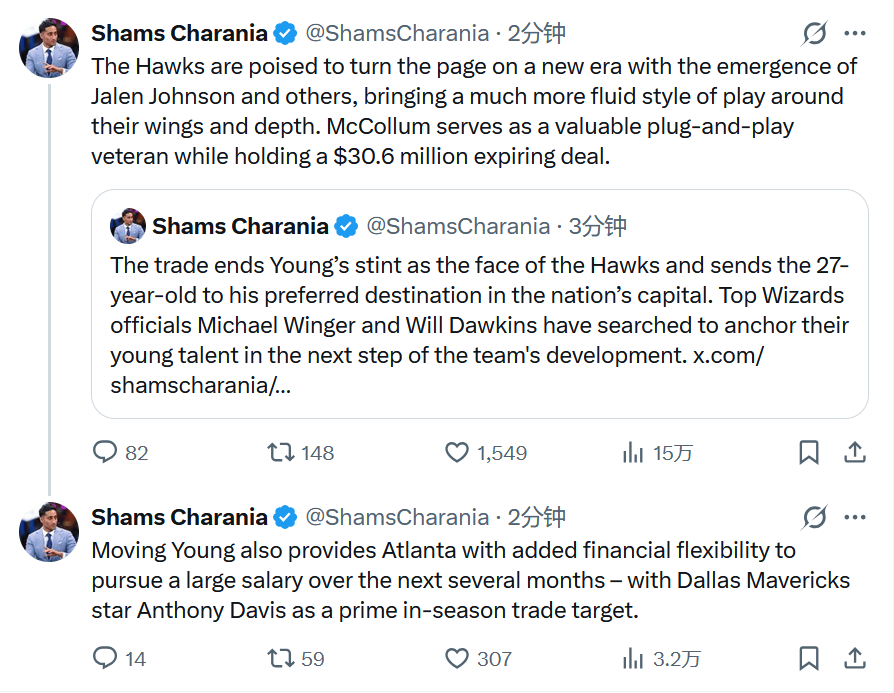 名记Shams报道称,老鹰队将特雷杨交易至华盛顿奇才队,换来麦科勒姆和基斯珀特。Shams对此写道:“老鹰队迎来新时代,杰伦-约翰逊等新星崛起,球队将围绕侧翼球员和深度阵容,展现出更加流畅的比赛风格。麦科勒姆作为一名经验丰富的即战力球员,同时也持有价值3060万美元的到期合同。”