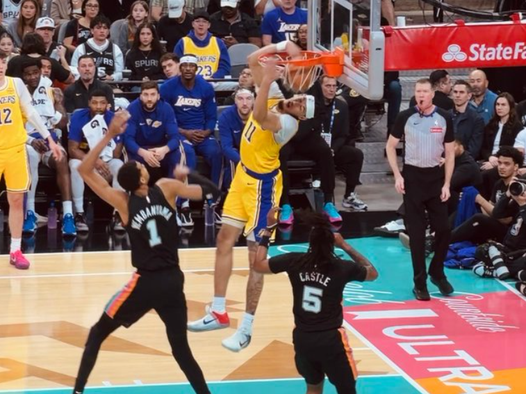 东契奇继续艰难造杀伤,拉拉维亚两记三分瞬间反超!此后东契奇连续强攻上篮,马刺则多点开花,湖人完全没内线防守,又被打穿。后半段约翰逊接球劈扣+底角三分,东契奇艰难对抗上篮。半场结束时,湖人43-48马刺。进入下半场,福克斯连续打出快攻,湖人全队失误太多。东契奇造杀伤+正面三分,当湖人再度追上比分时,又是失误,湖人落后5分左右就是追不上。后半段卡斯尔联合约翰逊内外开花,东契奇依旧艰难强攻,三节打完,湖人68-79落后马刺。决战第四节,拉拉维亚先中三分。