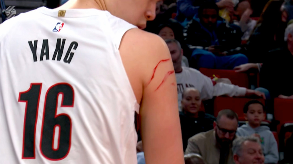 杨瀚森进攻端最令人惋惜的一幕发生在末节,杨瀚森在一次顺下配合中接球,他起跳试图完成一记势大力沉的扣篮,以此来提振士气。或许是此前与亚当斯的缠斗消耗了太多体能,皮球重重砸在篮筐弹出,错失了入选五佳球的绝佳机会。但这记扣飞的球并没有掩盖他在策应端的灵气,全场送出的几次助攻都极具穿透力。在克林根拿下12分7篮板专注于内线吃饼的同时,杨瀚森正在用另一种方式诠释自己的战术价值。杨瀚森全场+2正负值难能可贵,但本场比赛的主角无疑是砍下职业生涯高光数据的阿夫迪亚。这位开拓者前锋全场如有神助,狂轰41分6篮板,几乎凭借一己之力扛着球队前进,而杨瀚森右臂上那2道道触目惊心的血痕成为这场比赛的话题之一。