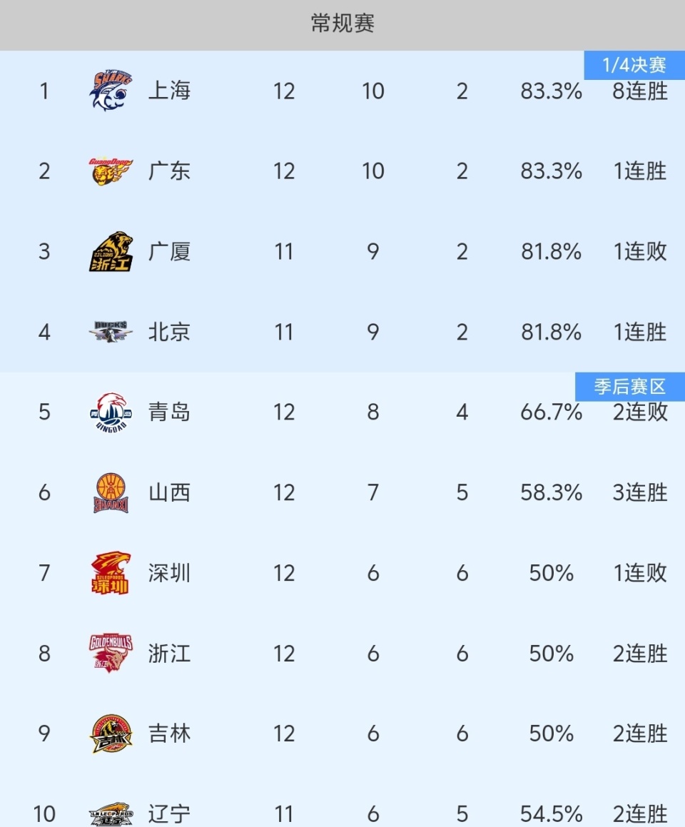 北京时间1月8日,CBA常规赛继续进行,浙江队客场95-60大胜广州,终结了对手的三连胜,目前浙江6胜6负,排名第8,吉林主场77-74险胜福建,紧随其后排名第9,北控81-79险胜四川,北控5胜7负排名第11,山西队103-99险胜天津,山西7胜5负,排名第6!