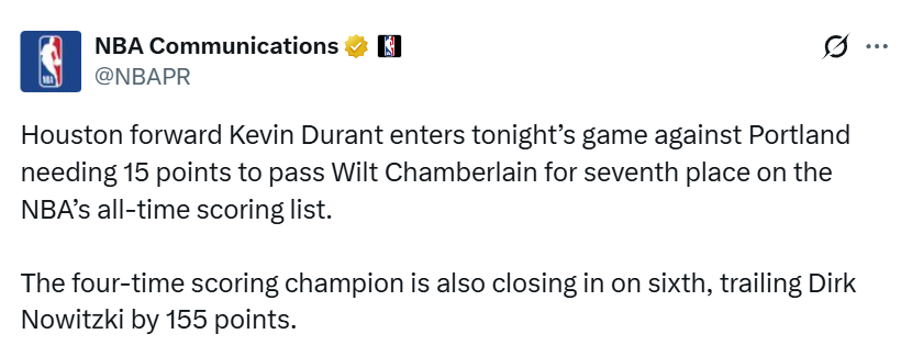 目前总得分31405分的杜兰特,距离第六位也无需等待太久。他与德克-诺维茨基的31560分之间也仅差155分,大概率能在火箭队接下来的主场系列赛中完成超越。