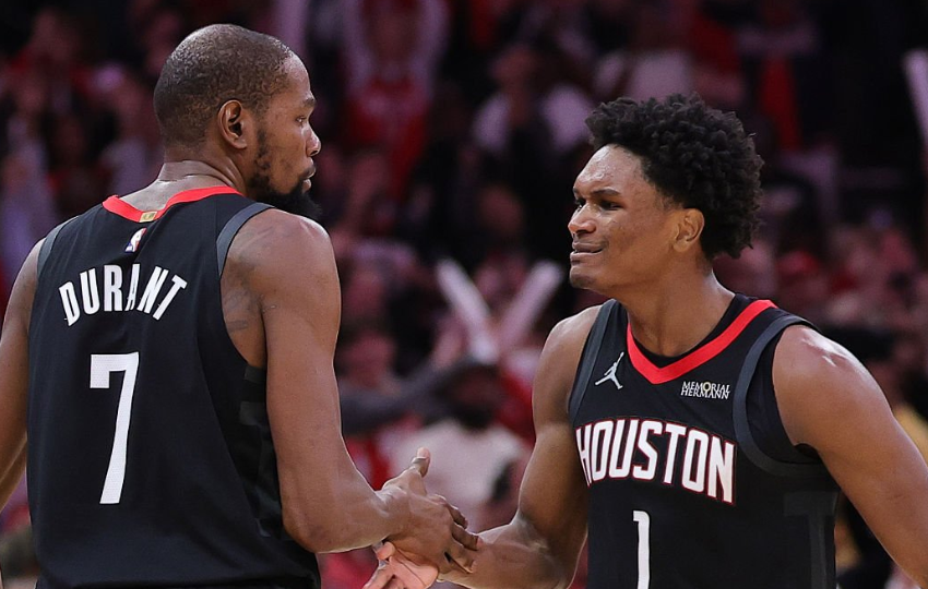 如今,作为火箭队的老将领袖,杜兰特成了现任队友们的偶像,就像当年那些传奇球星曾是他的偶像一样。2007年秋天,杜兰特代表早已搬迁的西雅图超音速队完成NBA首秀时,史密斯和阿门-汤普森才4岁。他们一辈子都在看杜兰特打球,而过去几个月,他们终于圆梦,成为了他的队友。