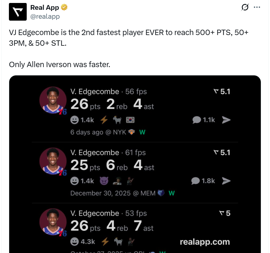 这让埃奇库姆仅花费32场比赛,就砍下至少500分+50记三分+50抢断,创造NBA历史第二快纪录,仅次于艾弗森,只能说埃奇库姆前途无量,76人的未来属于这名年仅20岁的年轻人。