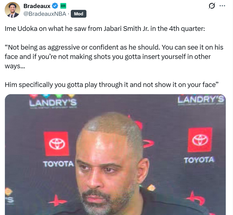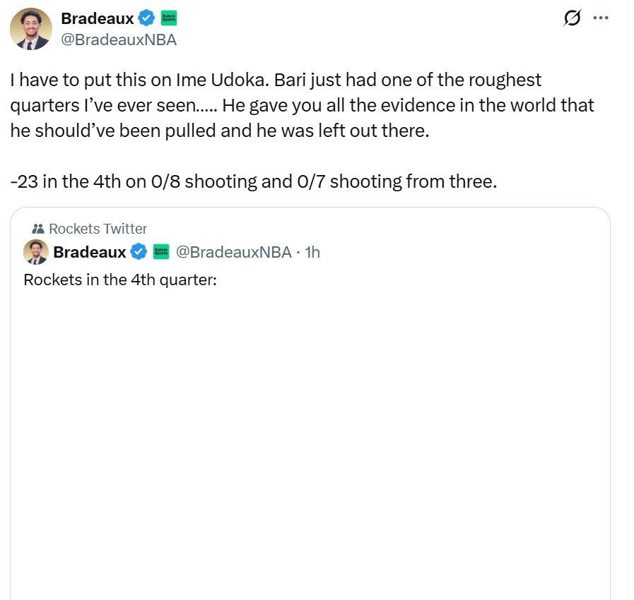 赛后连火箭媒体人Bradeaux都感到不解:“我这一次不得不把比赛失利的责任归咎于乌度卡,小贾打出了生涯最挣扎的一节比赛,他已经用各种方式证明他需要被换下场,结果乌度卡依旧将其留在场上。”