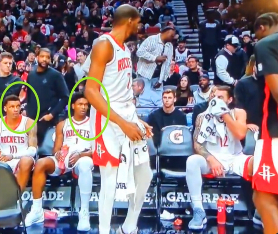 从慢镜头来看,坐在杜兰特身旁的阿门与小贾都被杜兰特这突如其来的发怒吓呆了,怔怔得看着杜兰特。