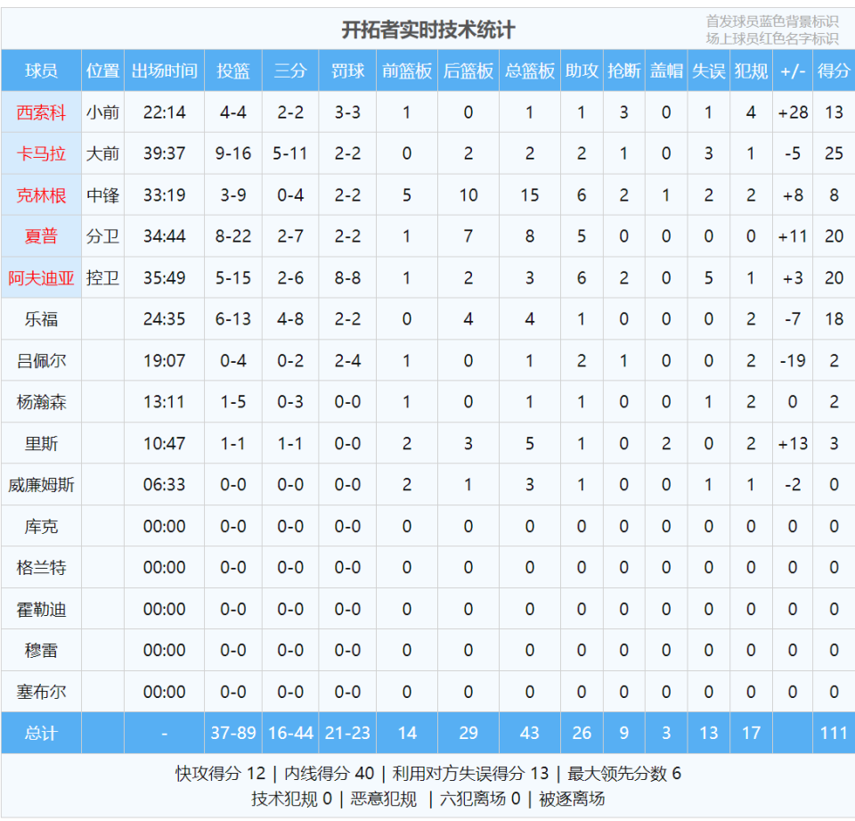 “战犯”小史密斯同样打了40分钟,21中6,其中三分10中0,罚球2中1,得到13分8板1助,正负值-19;