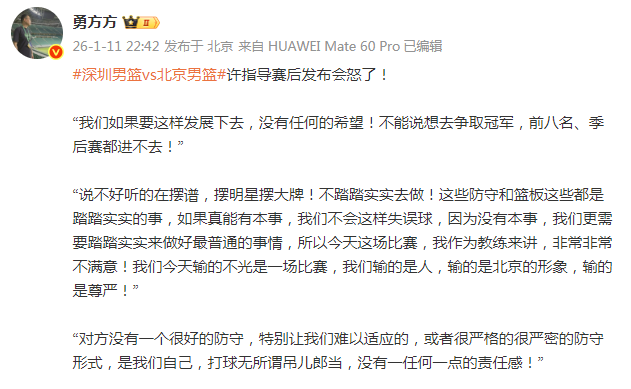 客场110-118不敌深圳队后,北京男篮主教练许利民在赛后的新闻发布会上非常生气。他表示,再这么发展下去,北京队别说争冠,就是季后赛都进不去。同时,他斥责有的球员摆谱耍大牌。