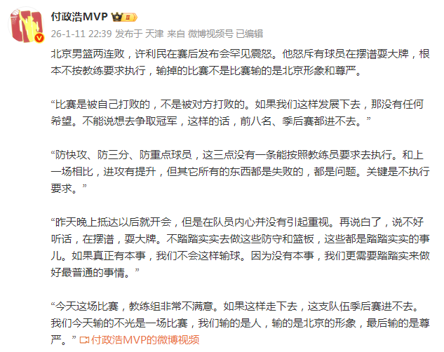 “说不好听的在摆谱,摆明星摆大牌!不踏踏实实去做!这些防守和篮板这些都是踏踏实实的事,如果真能有本事,我们不会这样失误球,因为没有本事,我们更需要踏踏实实来做好最普通的事情,所以今天这场比赛,我作为教练来讲,非常非常不满意!我们今天输的不光是一场比赛,我们输的是人,输的是北京的形象,输的是尊严!”