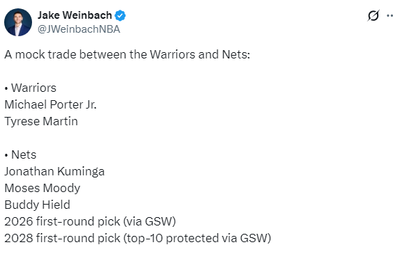记者Jake Weinbach预测勇士和篮网交易方案——勇士得到小波特和泰瑞斯-马丁;篮网得到库明加、穆迪、希尔德、2026年勇士首轮和2028年勇士首轮(前10保护)。