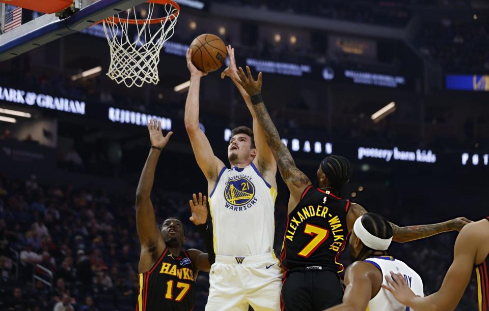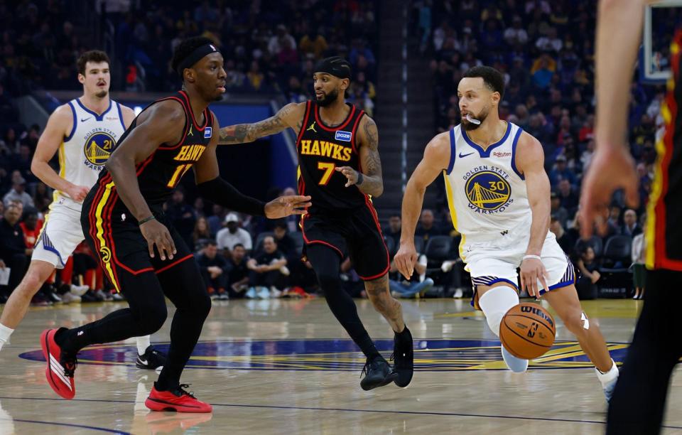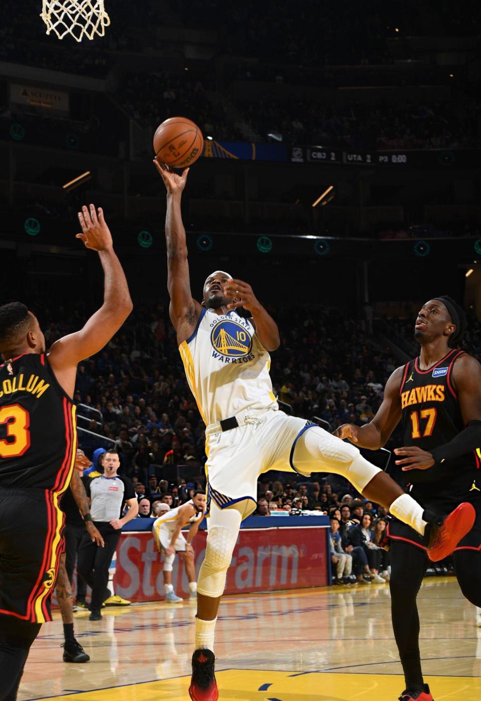 末节决战,奥孔古和肯纳德三分再中,库里打成2+1,肯纳德和奥孔古再次连续命中三分拉开到25分领先。追梦上篮得手,梅尔顿连续得分。基斯波特两罚全中,沃克投篮得手。随后勇士队打出进攻高潮,巴特勒和库里各得5分打出10-0缩小到15分!奥孔古和佩顿先后得手,巴特勒打成2+1后,麦科勒姆同样打成2+1,勇士队换下主力宣告投降,老鹰队客场取得胜利。