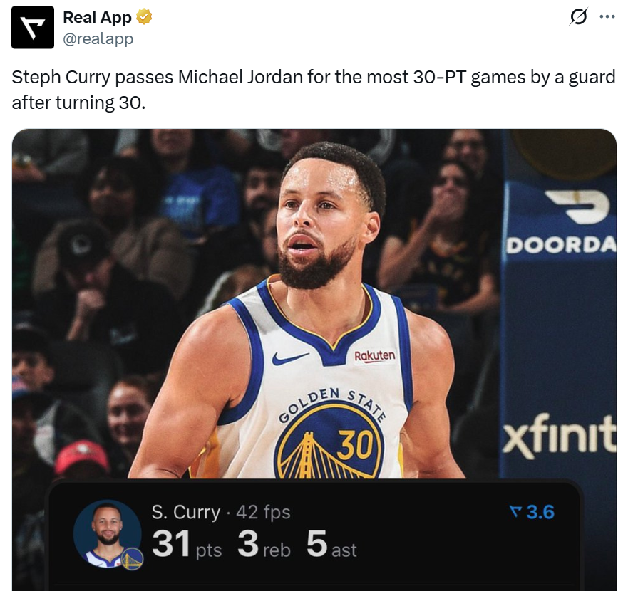 凭借这样的表现,库里30岁后第176场砍下30+得分表现,成功超越“篮球之神”乔丹升至NBA历史后卫第一。