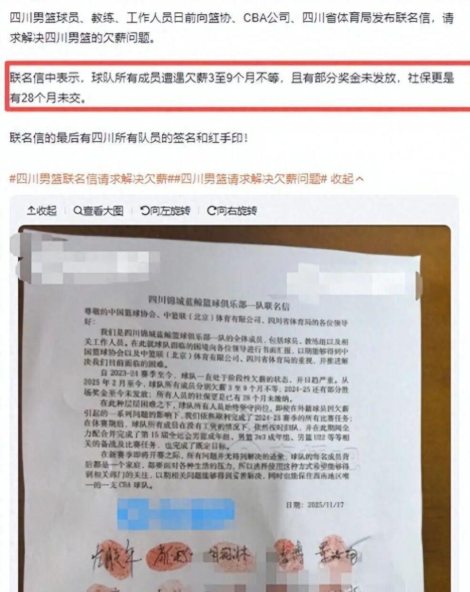 后来好不容易搭上了注册的末班车,到了2025年11月17日又出现风波,一封集体讨薪的联名信出现在网络上,这封联名信详细列出了俱乐部的“三宗罪”:从2025年2月起拖欠工资,2024-25赛季胜场奖金至今未发,最严重的是所有人员的社保已断缴28个月。