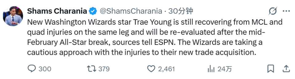 华盛顿奇才队新援特雷-杨仍在恢复右腿内侧副韧带与股四头肌的伤势,他的恢复情况将在二月中旬的全明星周末结束后重新评估。对于这位通过交易新加盟球队的核心球员,奇才队在其伤病恢复问题上采取了谨慎态度。