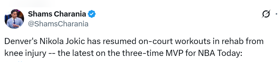 Shams报道称,掘金球星约基奇已经恢复了队内训练,而且恢复进度完全符合预期,甚至还稍稍提前了。按照计划,他有望在本月底重返赛场,这也和球队最初给出的四周康复初步时间表基本吻合。