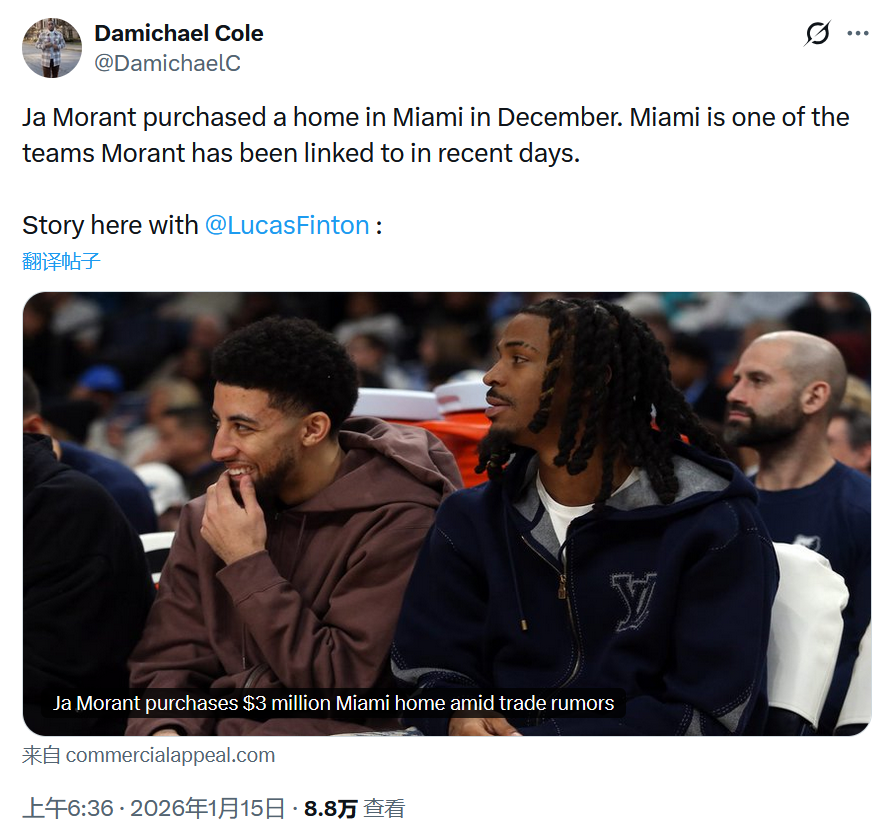 北京时间1月15日,NBA常规赛继续进行。根据灰熊队记报道称,莫兰特在迈阿密花320万美元购入一处房产,距离热火队主场仅有四英里。