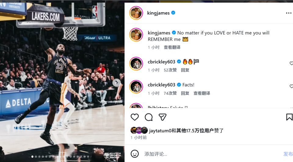 在Instagram动态中,詹姆斯为多年来支持他的人、以及那些对他恶语相向的人,都留下了这句震撼的话。他还附上了湖人以141-116战胜老鹰一役的多张赛场照片。塔图姆在内的多名球员为詹姆斯点赞。