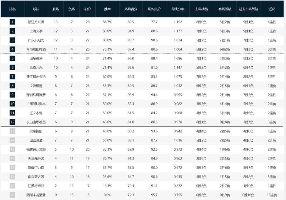 CBA积分榜:山东8连胜升第五,上海狂胜广东升第二,四川15连败