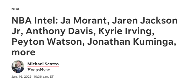 北京时间1月17日,离NBA交易截止日还有三周,HoopsHype汇总了关于灰熊球星贾-莫兰特、小贾伦-杰克逊,独行侠球星安东尼-戴维斯、凯里-欧文,掘金前锋佩顿-沃特森以及勇士前锋乔纳森-库明加的最新消息。