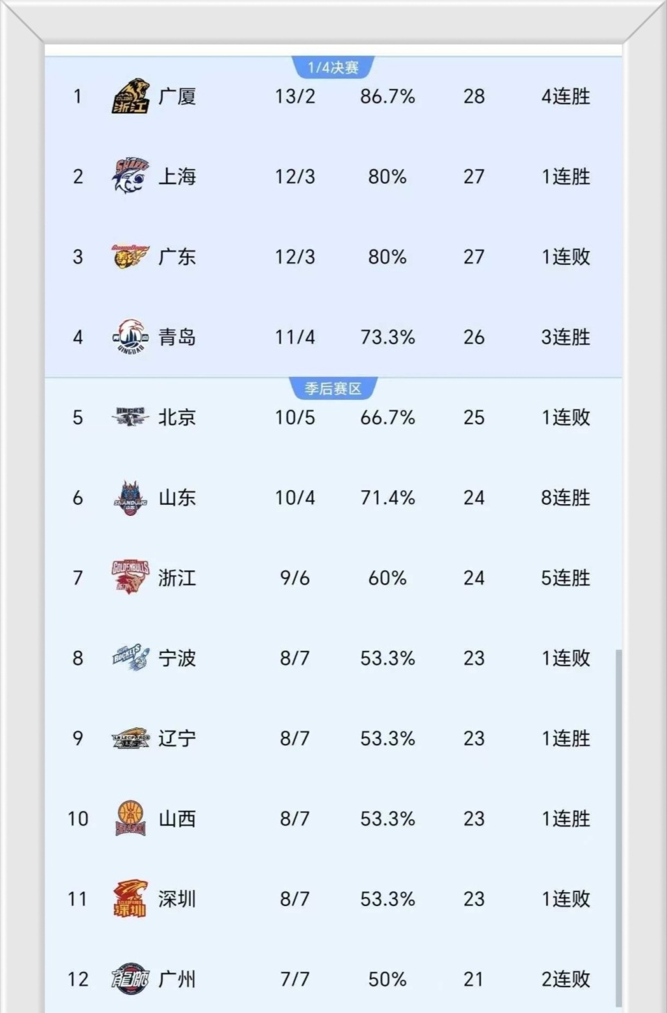 ②、青岛队11胜4负反超北京队的10胜5负,排名第4;