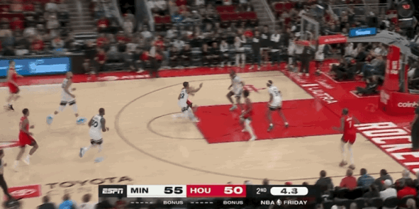 次节比赛,火箭在衔接段陷入进攻得分荒,长达4分07秒没有任何运动战进球,只能依靠罚球勉强取得1分,这让森林狼再次抓住机会拉开分差。杜兰特在本节还剩下6分51秒回归,他登场就攻传结合助力火箭连得5分。