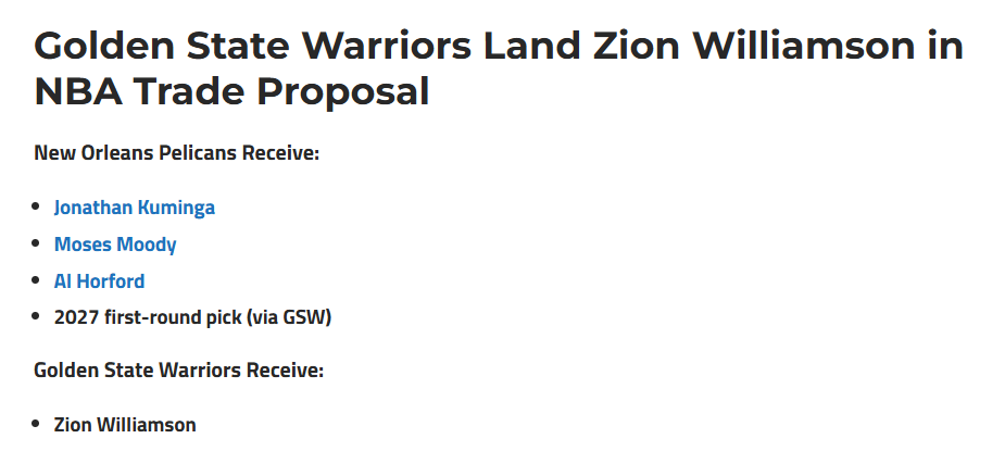 勇士成锡安头号热门下家!美记晒4换1交易方案:将库明加送往鹈鹕