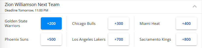 北京时间1月18日,锡安最新下家赔率出炉,勇士高居首位,他们成为了这位鹈鹕球星的头号热门下家。锡安下家赔率目前排在第1-6位的依次是勇士、公牛、热火、太阳、湖人和国王。随后美记James Piercey晒出了一份4换1的交易方案,认为这是双赢的选择。